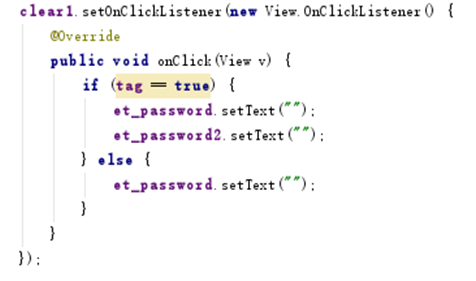 然後在clear按鈕點擊事件中,通過設置tag來控制密碼輸入欄的清空事件(tag初始設為true,在創建密碼界面中點擊clear會清除兩個密碼輸入框中的所有內容,在輸入密碼的登錄界面中點擊clear隱藏的密碼框中的內容不會清除,通過與隱藏了的密碼框中的已存儲的密碼進行比較確認輸入的密碼是否正確):