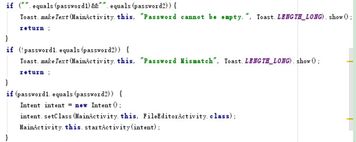 在OK按鈕點擊事件中,設置若 New Password為空,則發出Toast 提示。若New Password 與 Confirm Password不匹配,則發出Toast 提示,若New Password與 Confirm Password 匹配,則跳轉到文件編輯界面: