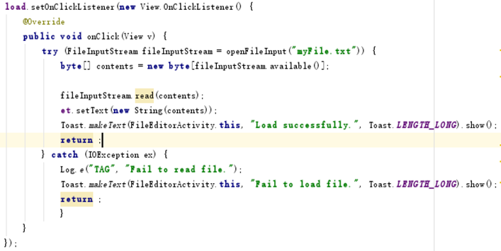 相應地,文件的讀取可以使用 openFileInput(String) 來讀取文件。該函數返回一個 FileInput- Stream,調用 read()方法讀取內容(寫在load點擊事件中):