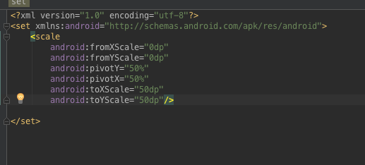 第一行的AnimationUtils是一個系統自帶的工具類,loadAnimation是加載動畫,裡面的參數是指從當前界面調用res裡面的anim文件夾裡的scale文件,下圖第一張為res文件設置,第二張為scale裡面的布局: