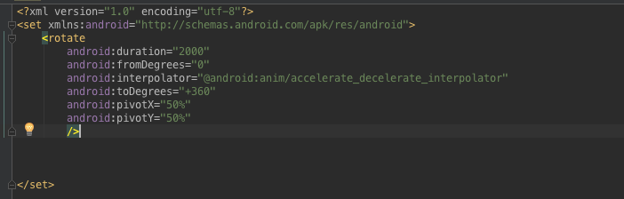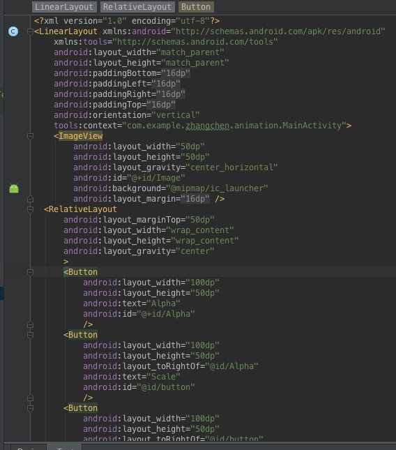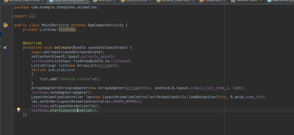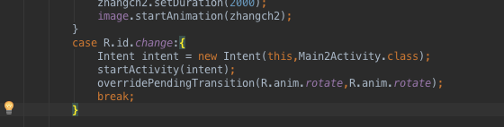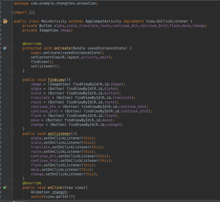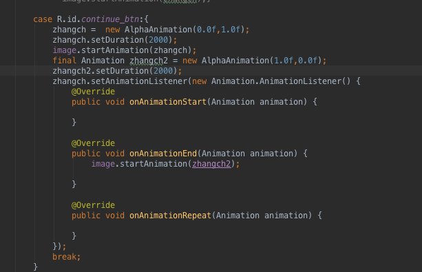 其中這裡需要有一個簡單的講解,對於上圖這個連續動畫的實現:我們這裡用的是一個設置監聽器的過程,在case執行的內容裡寫下兩個動畫,start一個動畫並且對這個動畫設置一個Animation