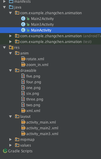共需要兩個java文件,兩個layout文件,這裡我們只用java代碼來實現動畫而沒有用布局調用是因為,java代碼的動畫可以更加適應於動態變換和管理,作為一名代碼人應該保證代碼優先選擇。