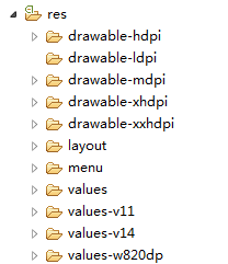 圖片資源: drawable-*。 其中 hdpi、ldpi、mdpi、xdpi、xxdpi 代表的是不同的分辨率的圖片配置文件。
