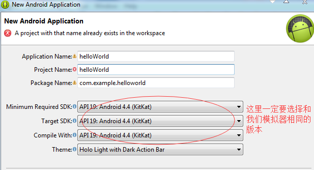 1.選擇 file>new>Android application project 創建我們的android項目然後給定相關項目信息及配置(如下圖)