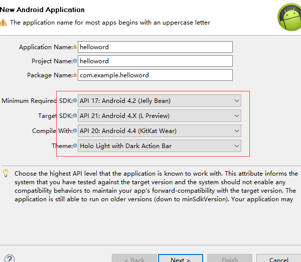 寫上項目名字,eg:helloworld,選擇安卓版本,這裡是4.2