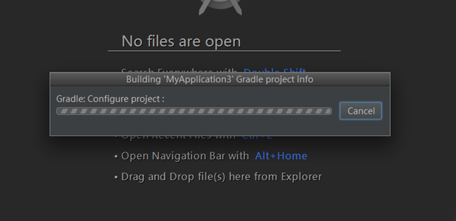 6、導入studio文件:直接用open按鈕,注意gradle和build tools的版本是否一置,否則會在打開時自動下載相應的構建工具沒有FQ基本就卡死了,可以在打開前去嘗試修改文件。