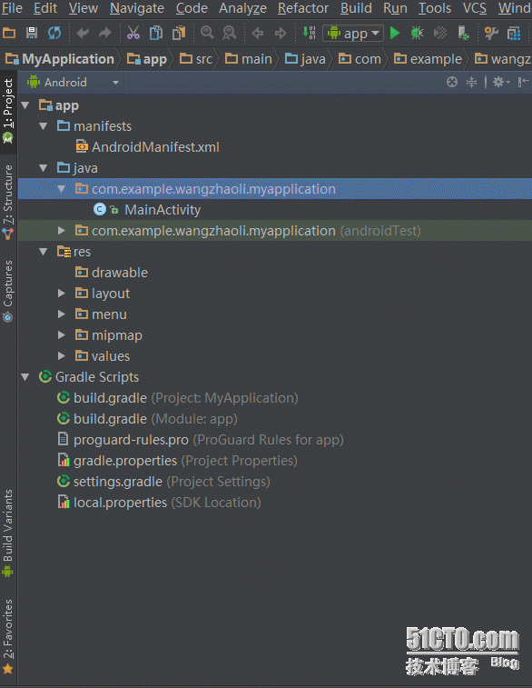 2、上述目錄中將java代碼和資源文件(圖片、布局文件等)全部歸結為src,在src目錄下有一個main的分組,同時劃分出java和res兩個文件夾,java文件夾則相當於Eclipse下的src文件夾,res目錄結構則一樣.