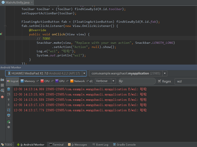 3.Android Monitor視圖中有Logcat、Memory等界面,關於Logcat使用起來也很方便;