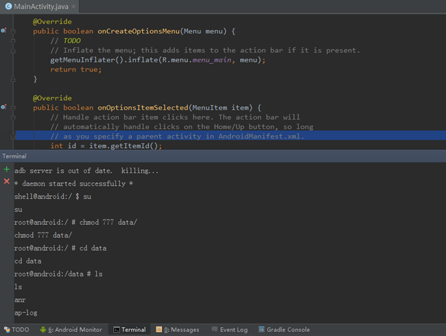 4.對比Eclipse,Android Studio非常有特點的地方要數自帶的“Terminal”了,對於Android開發人員來說這比單獨開一個cmd方便多了,使用起來特別自如;