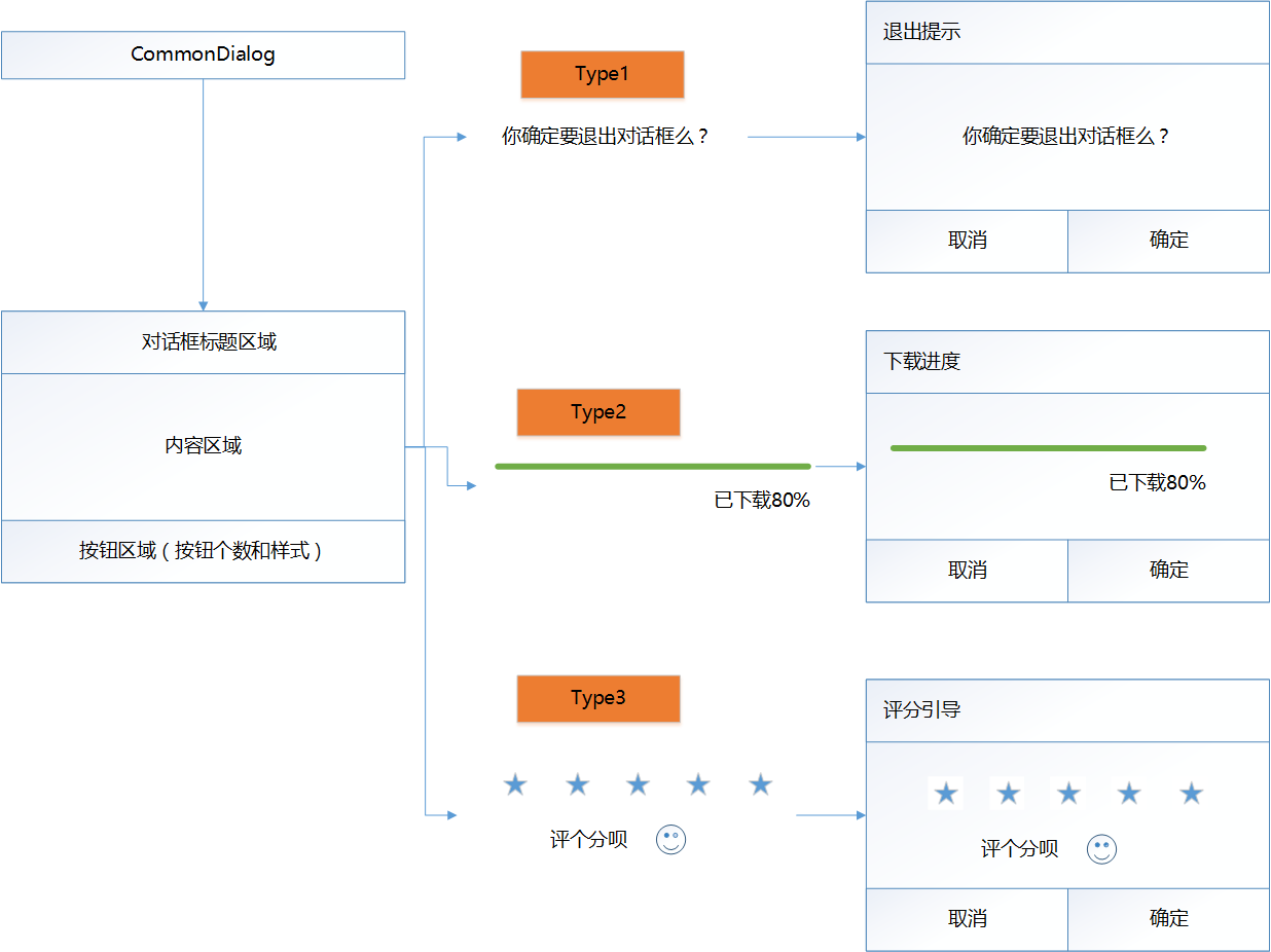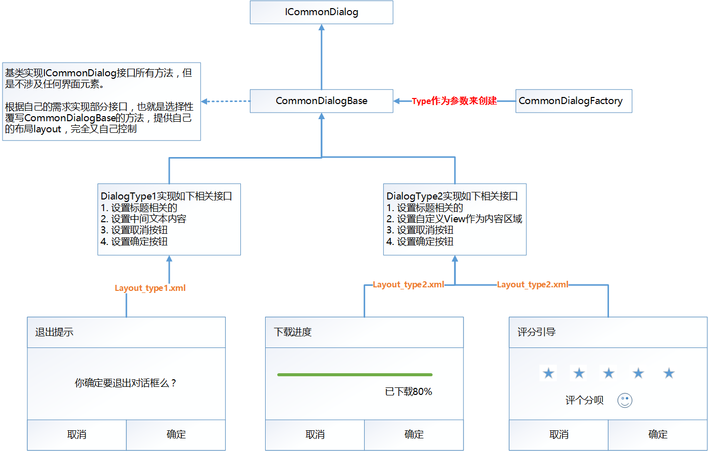 這種實現方式一般是項目剛開始的時候,寫彈窗的人一般都會這樣設計,本身沒什麼問題,如果彈窗樣式少並且彈窗布局都比較規范還是可以維護的。但是實際上這兩個條件在大項目中一般都不滿足的,首先彈窗樣式肯定不少,其實為了滿足產品各種需求,彈窗布局也會不同。現象一下,就一個對話框彈窗布局裡面要容納所的彈窗樣式,也就是一個CommonDialog包含了所有的彈窗邏輯,這本身就維護了單一性原則。而且越往後越難維護,所有人都改同一個類,同一個布局,第一次經手的人估計是有點難以下手修改的。為了解決這種現象,可以用下面的方式來代替。