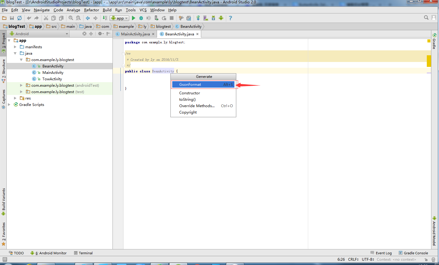說明:目前多數服務器端都以json格式返回,那麼相對應的解析時建立的實體類如果你還在自己挨個寫的話,那就out了。新建一個類,選擇Generate。