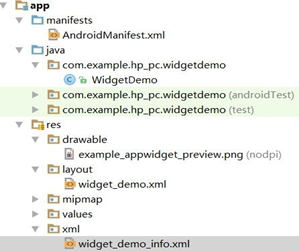 首先,在Android Studio中創建Widget類,直接生成相關文件,其中包括界面布局XML文件、widget的provider文件信息(xml)以及在項目的AndroidMenifest.xml文件中添加了一個receiver標簽,需要我們添加過濾更新事件,並需要指向之前創建的Widget類。