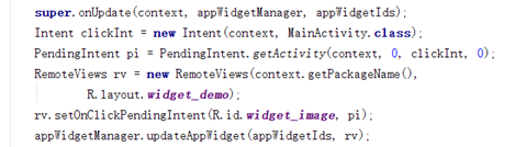 然後在Widget中,重寫onUpdate方法,為Widget添加事件,使得能夠返回主頁面。這裡需要使用到一種用戶程序訪問主屏幕和修改特定區域內容的方法RemoteView架構。RemoteView架構允許用戶程序更新主屏幕的View,點擊 Widget激活點擊事件,Android會將其轉發給用戶程序,由AppWidgetProviders類處理,使得用戶程序可更新主屏幕Widget。