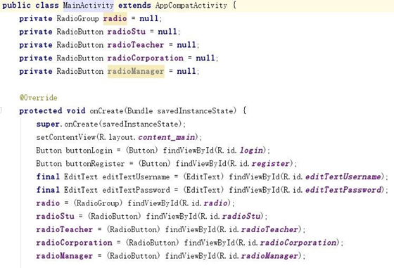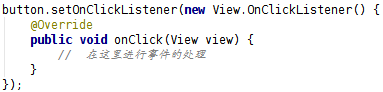 要處理事件,首先要將與該事件有關的控件引入進來,比如要判斷用戶名是否為空,那麼 除了 Button 需要引入外(因為 Button 是觸發事件的主體),還需要引入用戶名的輸入框。 引入之後,button.setOnClickListener()中做處理,這裡的 button 是一個變量名,記得 換成自己定義的變量名。