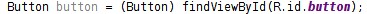 findViewById()方法帶一個參數,就是剛剛定義的那個 id,參數形式為 R.id.XXX,其中 XXX 就是剛剛定義的那個 id,由於 findViewById()方法返回的是一個 View 類型,所以需要 強制類型轉換為 Button 類型。