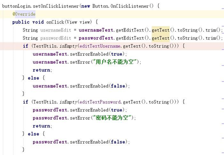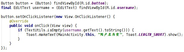 onClick 方法帶的 view 參數是觸發這個單擊事件的控件的引用,在這個例子中,view 就是 觸發事件的 Button,在 onClick()方法中做事件的處理,例如判斷用戶名是否為空:
