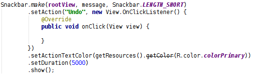 Google 在 2015 年的 IO 大會上發布了較之前更為詳細的 Material Design 規范和全新的 Android Design Support Library,Snackbar 就是其中的一個控件,可以用來代替 Toast 信息,除了用戶體驗更好以外,功能也更強大。先來看一下語法: