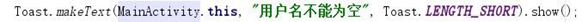 這個方法帶三個參數,context,text,duration。context 是一個上下文類型,寫上使用 這個方法的 java 類名加上.this 即可,text 是 Toast 要顯示的信息,duration 是 Toast 顯 示的時間長度,有 Toast.LENGTH_SHORT 和 Toast.LENGTH_LONG 可選,最後記得調用 show() 方法將 Toast 顯示出來。