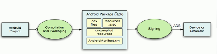 首先一個android項目,然後編譯和打包,將.java文件編譯為.class,.class編譯為.dex,將所有文件打包為一個apk,只編譯代碼,不編譯資源。