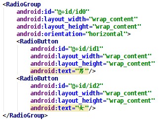 RadioButton是單選按鈕,一組單選按鈕需要包括在一個RadioGroup中,並且需要對RadioGroup和其包括的每一個RadioButton都設置id,RadioButton才能正常工作。示例: