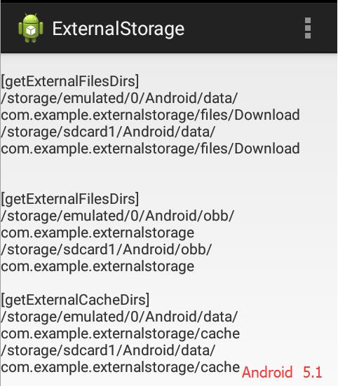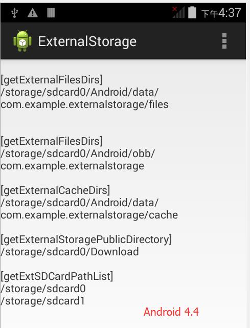 通過上面的函數在我的Android 5.1的系統上可以正確獲取sd卡路徑,但是在Android4.4系統上只能看到內部存儲的路徑。