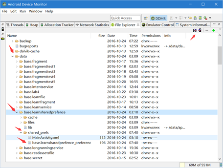 d.查看方式:點擊問號左邊圖標,知道data/data/包名/shared_prefs,右上角可以導出到電腦中查看