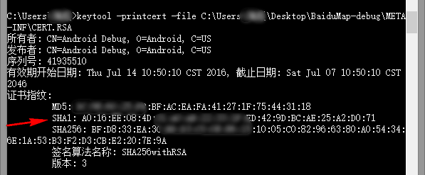 SHA1值:命令行窗口 >> keytool -list -v -keystore FilePath (FilePath:C盤 >> 用戶 >> .android >> debug.keystore)