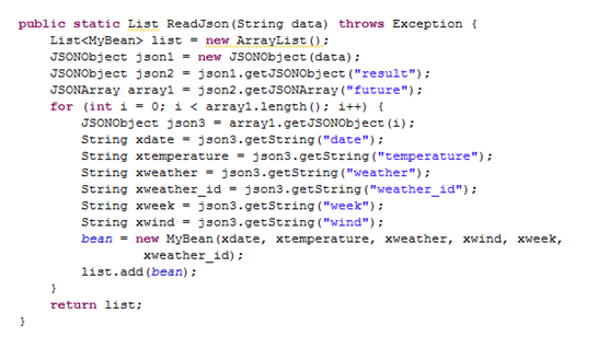 其次要了解一下兩種數據的數據結構。JSON數據分為三種:對象類型、數組類型、混合類型。對象類型JSON數據用大括號包裹,屬性和值相對應。數組類型JSON數據可以看成多個對象類型JSON數據組合在一起,用中括號包裹。混合類型JSON數據中既有對象類型又有數組類型,大括號表示的是對象,中括號表示的是數組。XML數據以標簽的形式進行存儲,通過標簽名獲取值。所以無論是JSON解析還是XML解析,都可以先定義一個雙列集合出來,用於存放數據。