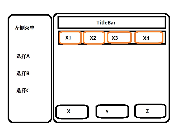 公共部分:左側菜單、TitleBar、RadioGroup(3個RadioButton:X、Y、Z)