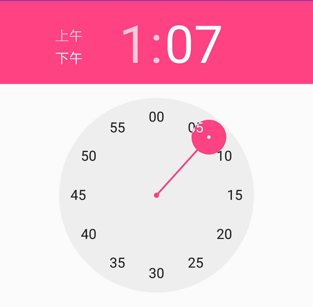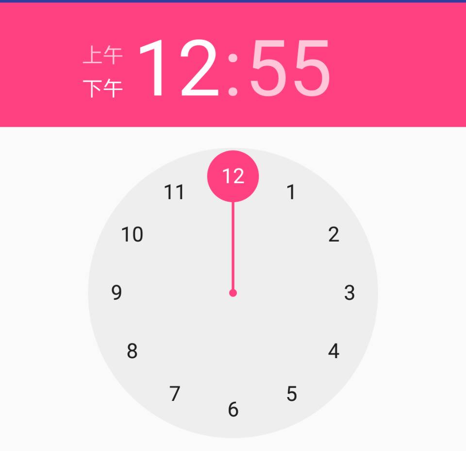 RadialTimePickerVIew:時鐘式的時間選擇器中的表盤, 其他TextView:顯示的小時數和分鐘數,上下午顯示等(看TimePickerCLockDelegate的成員變量就可以知道)4.所以最後也是最重要的就是表盤RadialTimePickerVIew的繪制,他裡面的知識或者思想可以用在很多的地方。比如一個文字兩種顏色或背景色(其實就是用到了畫圖區域的補集和余集知識)。