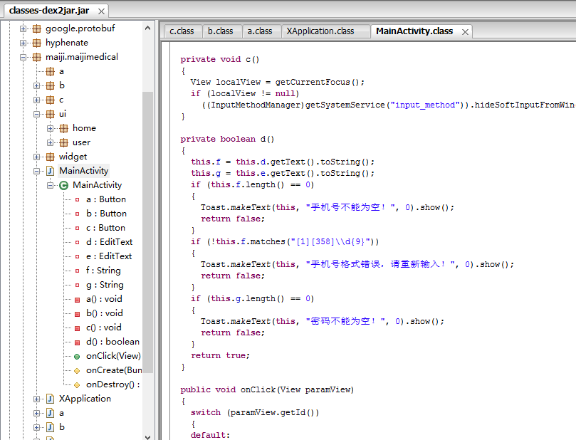 之後用該工具打開之前生成的classes_dex2jar.jar文件,便可以看到源碼了,效果如下: 命名變成了a,b,c,d等等說明成功