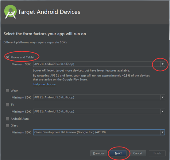 3、如圖選擇自己要開發程序所運用的平台,並按自己的需求選擇SDK的版本,然後“Next”