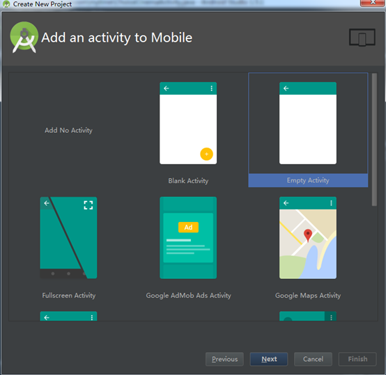 4、選擇一個默認的Activity模式,然後選擇“Next” 如圖: