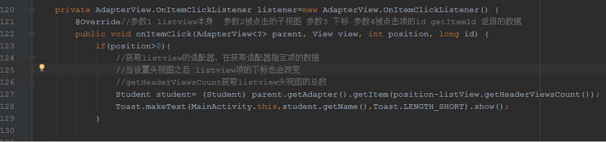 這個監聽的例子是設置了一個頭視圖 項的下標改變 所以用 position-listview.getHeaderViewsCount() 計算項的下標位置 獲取正確的對象