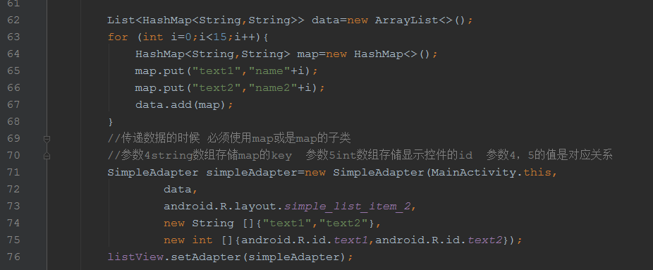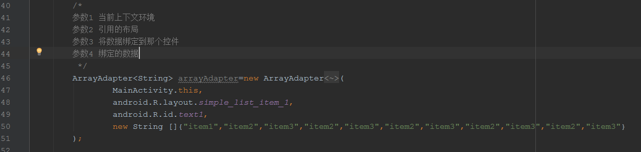 是android自帶的一個簡單布局 裡面只包含一個id為text1的TextView 也就是參數3 ArrayAdapter只能顯示一行數據 顯示文本信息 使用這個系統提供的布局就可以