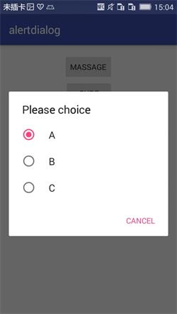 59 .setSingleChoiceItems(new String[]{"A", "B", "C"}, 0,