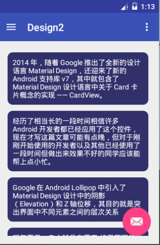 private String[] data={"2014 年,隨著 Google 推出了全新的設計語言 Material Design,還迎來了新的 Android 支持庫 v7,其中就包含了 Material Design 設計語言中關於 Card 卡片概念的實現 —— CardView。"