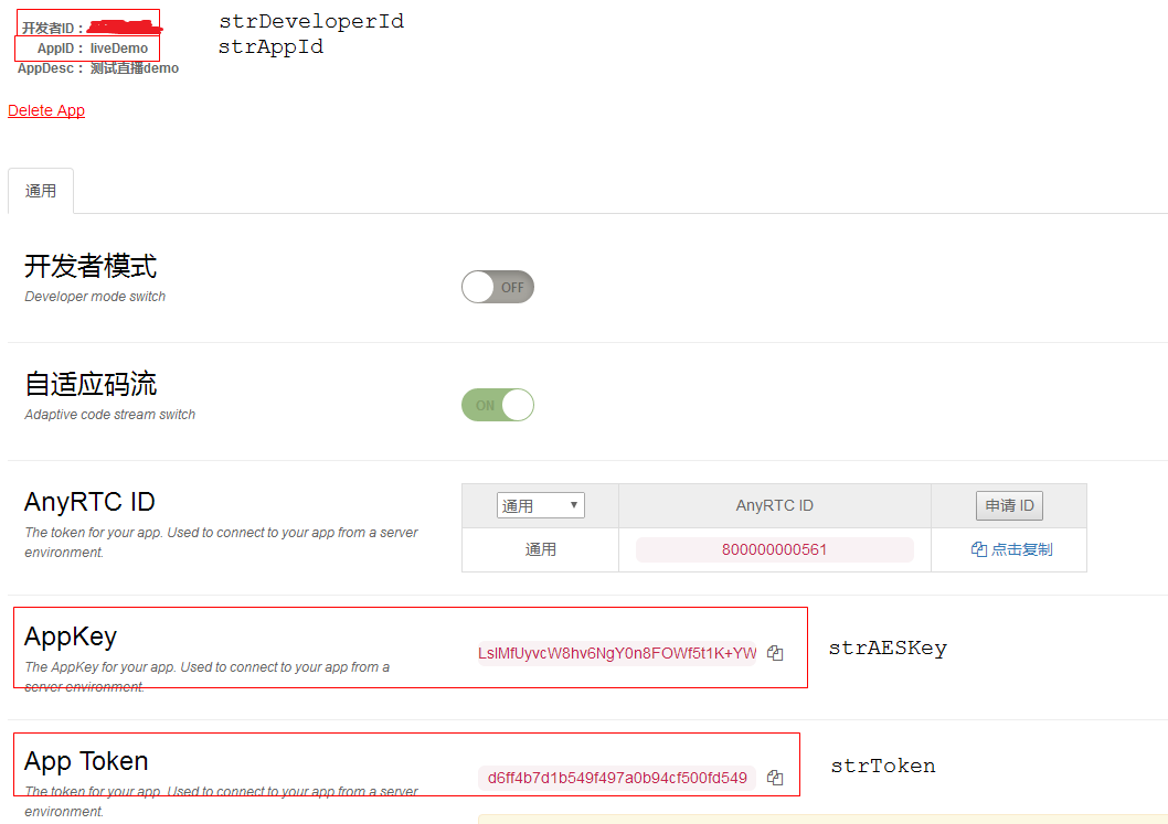 以上的四個參數可以在https://www.anyrtc.io注冊開發者賬號並創建一個應用可得,如下圖所示。你可以把它放在繼承Application的onCreate()方法中。