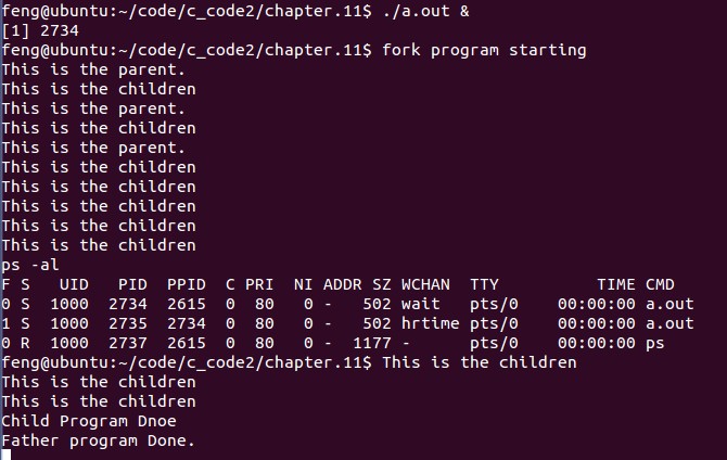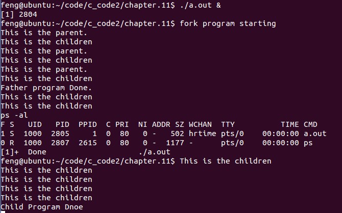 #include#include#include#include#includeint main(){ int count; pid_t pid; char *message; printf("fork program starting\n"); pid=fork(); switch(pid) { case -1:perror("forkerror"); exit(EXIT_FAILURE); break; case 0 :message="This isthe children"; count=10; break; default:message="This isthe parent."; count=3; break; } for(;count>0;count--) { printf("%s\n",message); sleep(1); } if(pid) wait((int *)0); if(pid) printf("Father programDone.\n"); else printf("Child ProgramDnoe\n"); exit(0); }我們讓程序在後台運行,並用ps命令查看進程狀態。