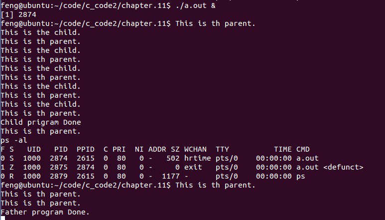 從輸出我們看到,pid為2949的子進程正常結束了,並未產生僵屍進程。說明子進程結束後,父進程收到了它結束的消息,並調用了wait回收了子進程的資源。從而避免了僵屍進程的產生。