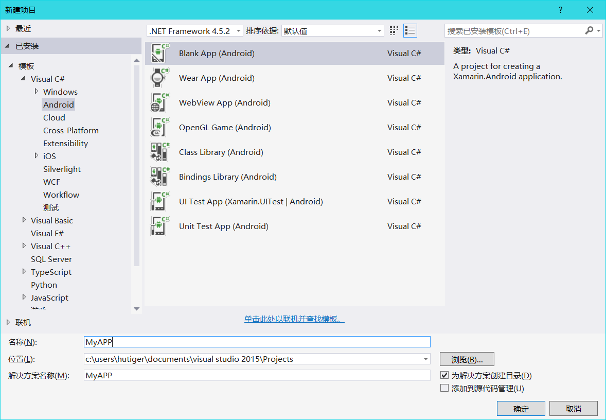 2.當安裝好vs2015和xamarin之後就可以點擊“文件》新建》項目“”創建Android項目了