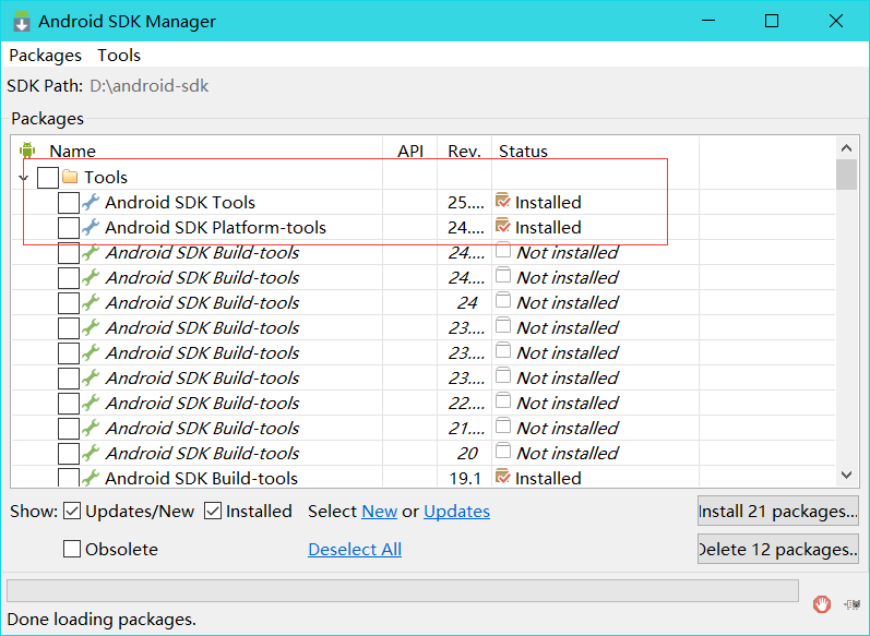 5.雖然已經成功配置了環境,但是還是不能運行,因為我的sdk版本比較低當你雙擊axml文件的時候屏幕會提示要求你升級sdk,於是我們需要打開sdk manager更新以下2個工具就行了