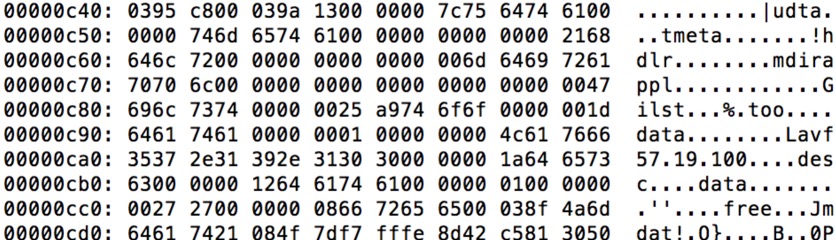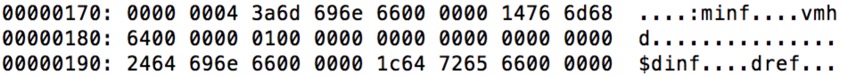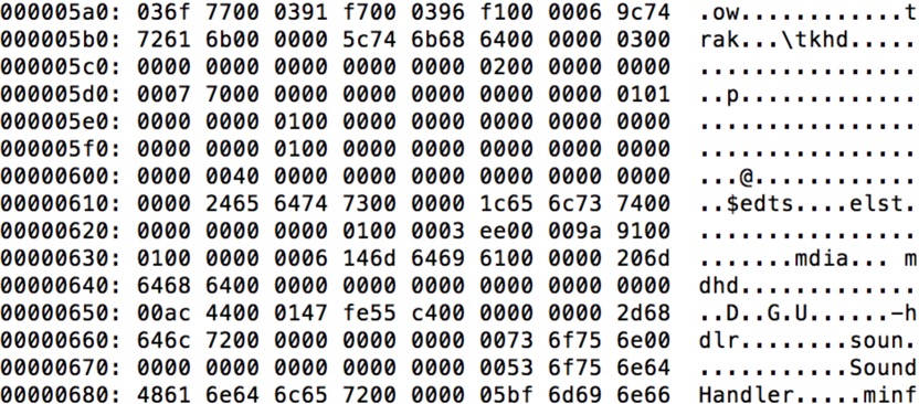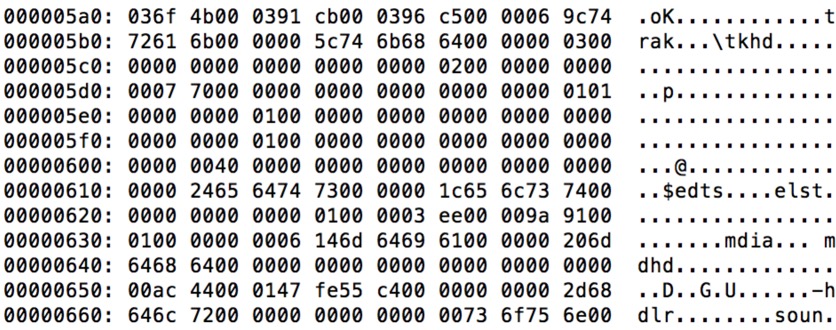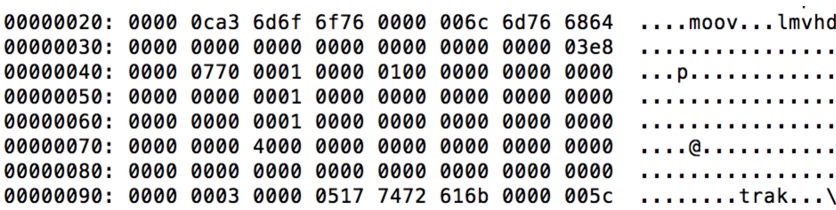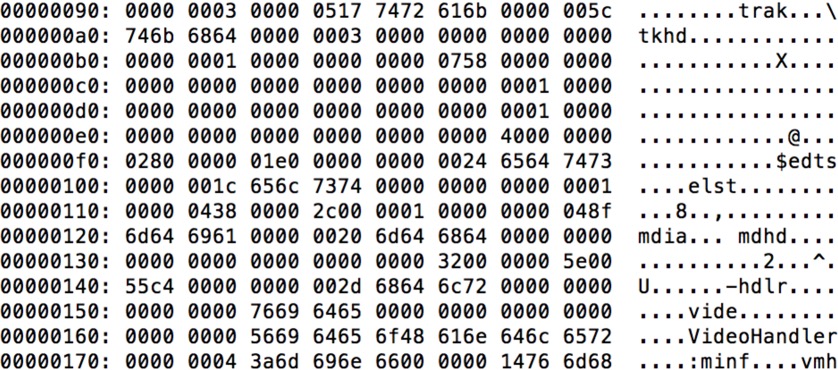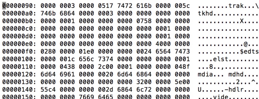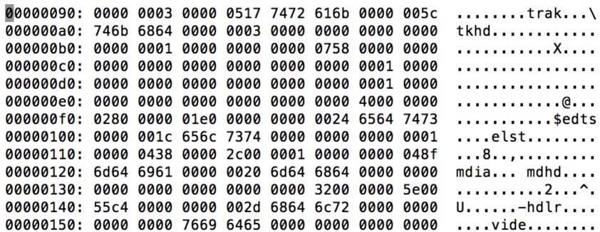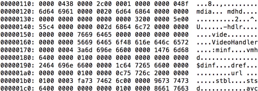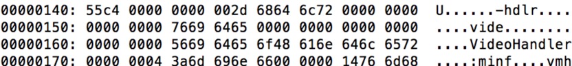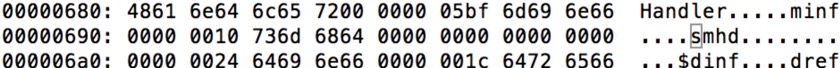 從上表中解析出來的對應的值可以看出來,這是一個視頻的Track對應的數據,對應的組件的名稱為VideoHandler和一個0x00結尾,hdlr容器解析完畢。字段