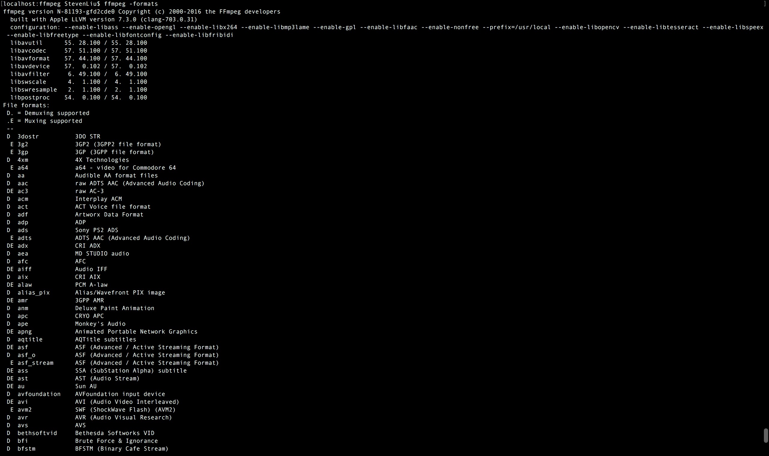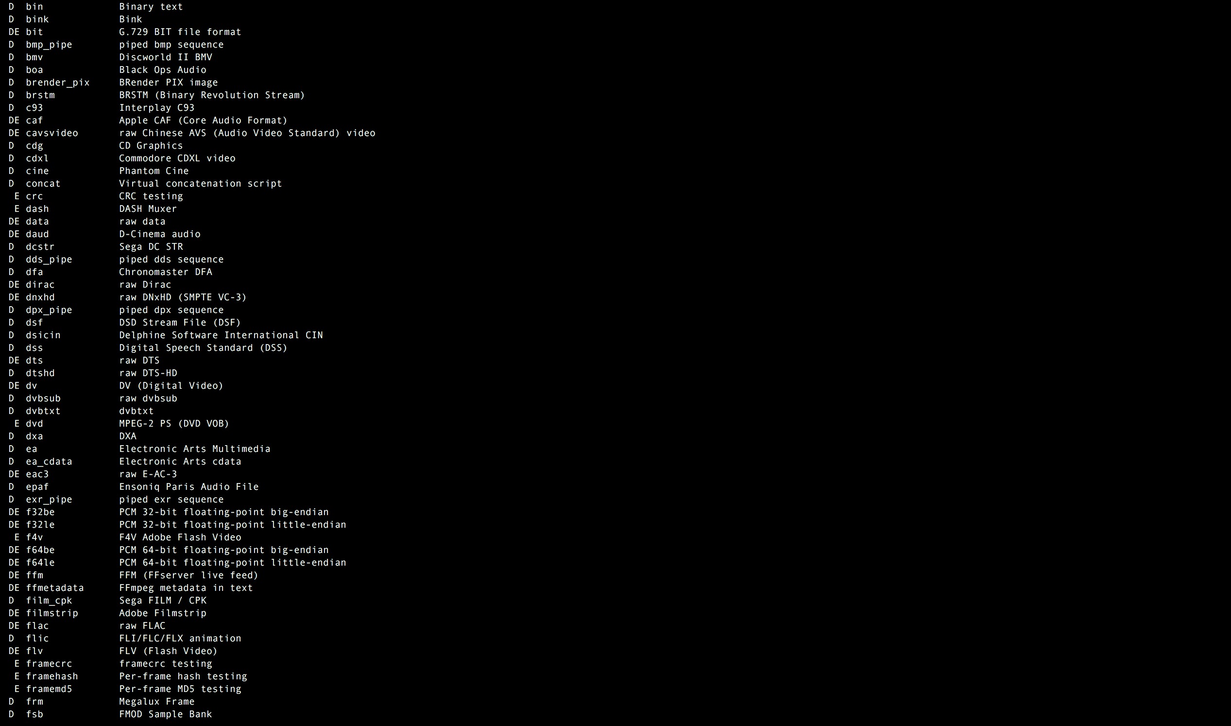 有時候使用ffmpeg轉碼,發現無法解析視頻文件,或者無法生成視頻文件,報一些不支持生成對應的視頻文件的錯誤,這個時候就需要查看當前使用的ffmpeg是否支對應的視頻文件格式,需要使用ffmpeg -formats來查看: