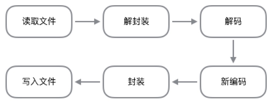 ffmpeg工具主要用途為編碼、解碼、轉碼,常用ffmpeg做的為轉碼操作,使用ffmpeg轉碼主要原理為: