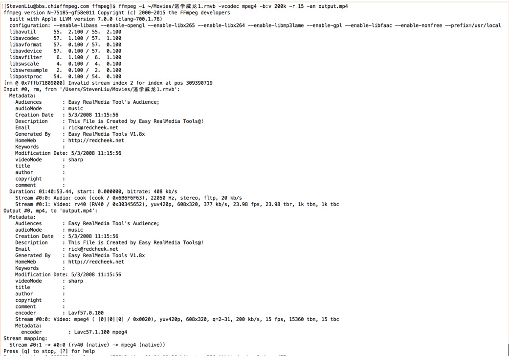 可以分析出,這個例子的流程與前面提到的流程相同,首先解封裝,需要解的封裝為rmvb,然後解碼,其中視頻編碼為rv40,音頻編碼為cook;然後解碼後的視頻編碼為mpeg4,然後封裝為一個沒有音頻的mp4文件。