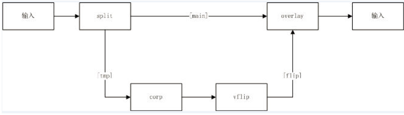 圖中這個例子中的filtergraph講輸入的視頻切割成了兩部分流,一部分流拋給crop與vclip進行操作,另一部分保持原樣,當crop與vflip操作完成後,將流合並到原有的overlay中,並顯示在最上面一層,輸出新的視頻,對應的命令行如下: