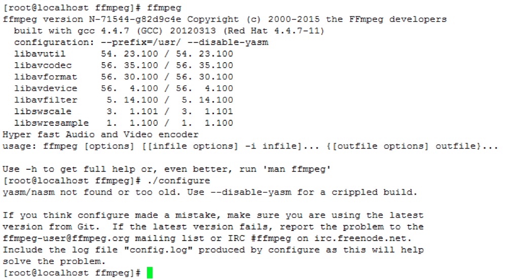 FFmpeg在很多Linux的發行版本源中已經包含,例如Ubuntu / Fedora的鏡像源中包含了安裝包,但是版本相對來說比較老,有些甚至不支持H264、H265編碼,或者不支持rtmp協議等,為了支持這些協議,編碼,需要自己手動編譯一套FFmpeg,所以在Linux下面,推薦的最好的FFmpeg就是根據自己的需求進行定制的FFmpeg,默認編譯FFmpeg的時候,需要用到yasm匯編器對FFmpeg中的匯編部分進行編譯,如果不用匯編部分的代碼,可以不安裝yasm匯編器。默認執行配置的時候,提示錯誤: