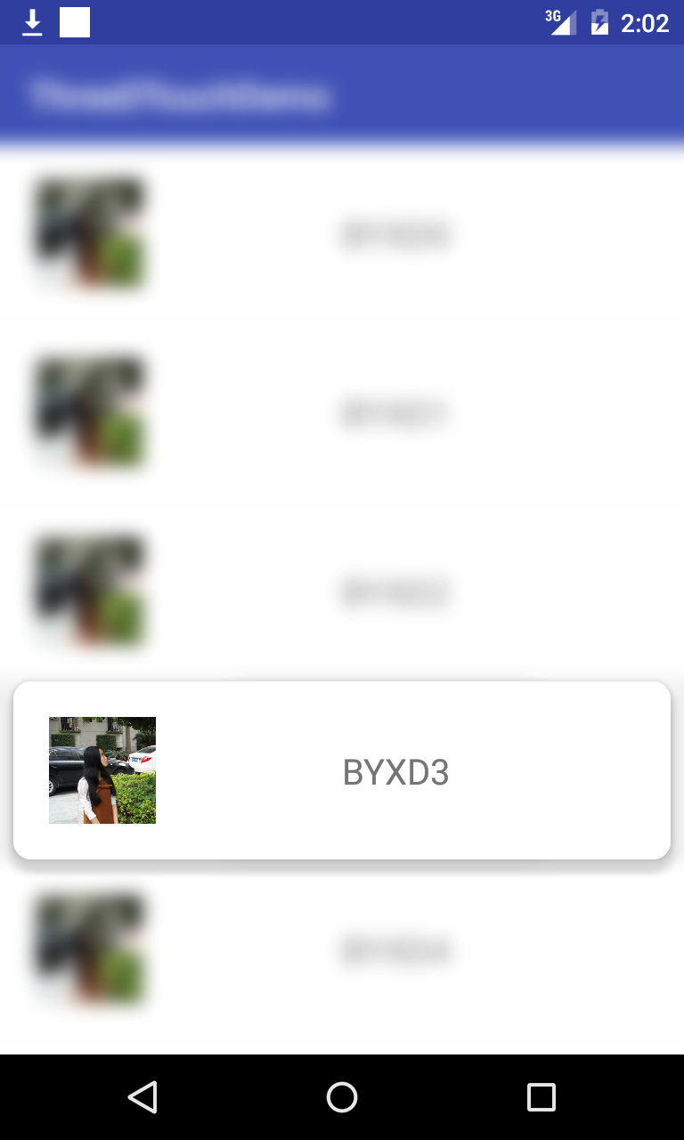 流程:當用戶長按一個Item的時候,我們先截取一張當前屏幕的圖片,接著將這張圖片進行高斯模糊,再覆蓋在整個布局上面(包括覆蓋Toolbar),這樣界面模糊的效果就出來了。接著我們動態的向界面添加一個CardView來呈現我們的Item布局,這個CardView要出現在我們點擊的對應的Item上。最後添加一個對應3D Touch彈出的動畫即可。