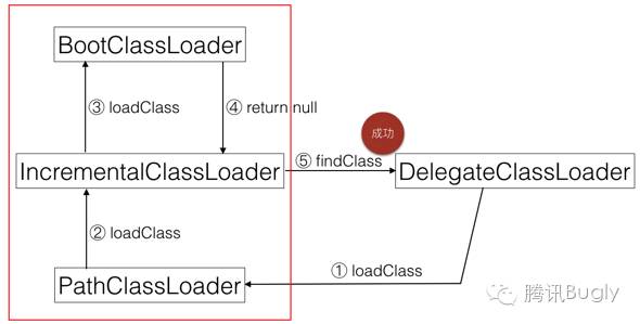 在 DelegateClassLoader 加載業務代碼的時候(業務代碼在 classesN.dex 中),流程會沿著標記的順序最終第 5 步成功加載到業務代碼。業務代碼如果依賴 patch 庫的代碼,會在 PathClassLoader 加載。這樣所有代碼都可以被加載到。